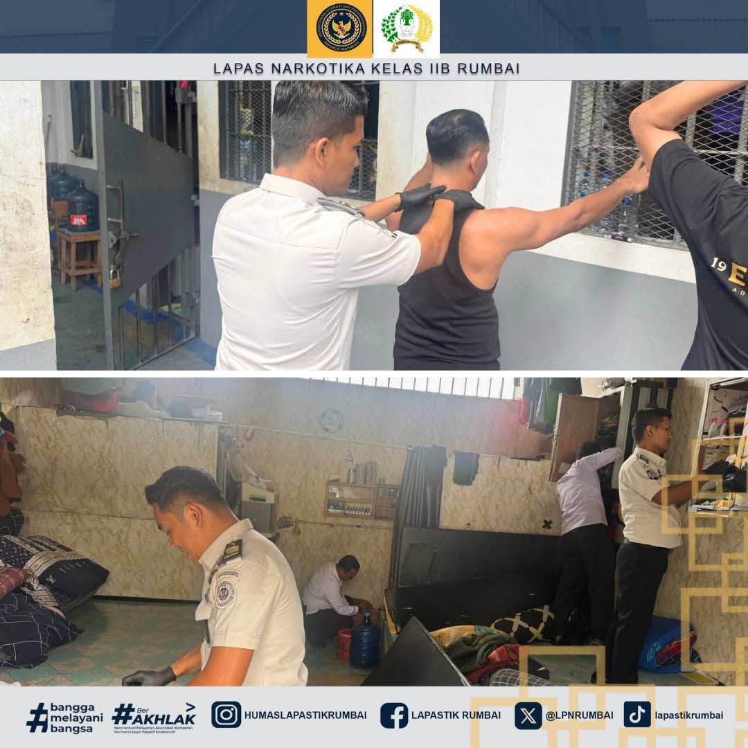 PEKANBARU || MARKIBONG.COM – Dalam rangka melaksanakan Astacita Presiden dan Wakil Presiden Republik Indonesia, arahan Menteri Imigrasi dan Pemasyarakatan terkait 15 Program Aksi Kementerian Imigrasi dan Pemasyarakatan khusus nya pada poin 6(enam) mencakup pemberantasan peredaran Narkoba dan Handphone dilingkungan Lapas dan Rutan, Lapas Narkotika Kelas IIB Rumbai melaksanakan Razia Blok Hunian yang dilakukan kepada Warga Binaan pada Senin, (26/1/2026).