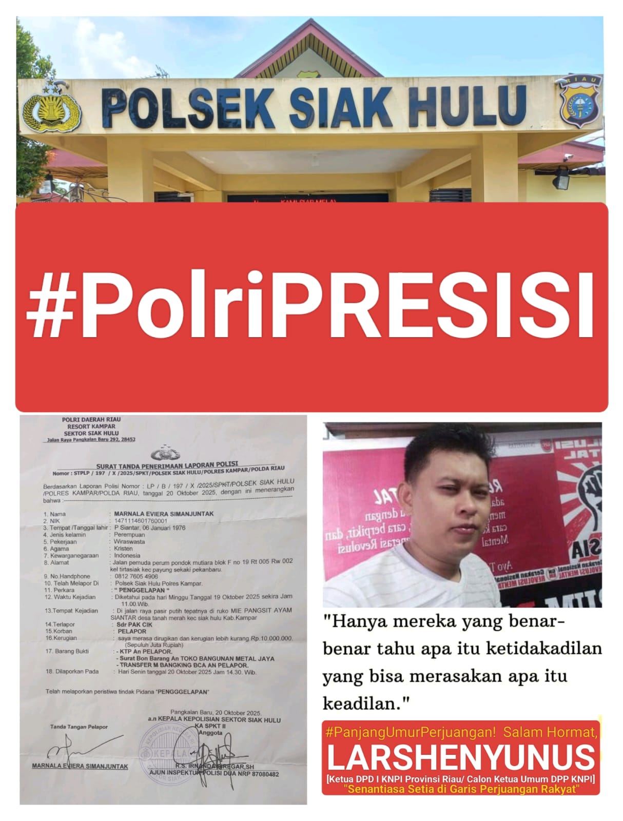 Pria tinggi tegap yang juga mantan Ketua Umum Kamar Dagang dan Industri (KADIN) Riau itu kembali menyampaikan optimismenya, bahwa Surat Tanda Penerimaan Laporan Polisi alias STPLP dengan nomor register: LP/B/197/X/2025/SPKT/SIAK HULU/POLRES KAMPAR/POLDA RIAU pertanggal 20 Oktober 2025 segera ditindaklanjuti dengan harapan hadirnya Solusi dan Keadilan atas segala Permasalahan yang dihadapi oleh Pelapor sekaligus Korban tersebut.