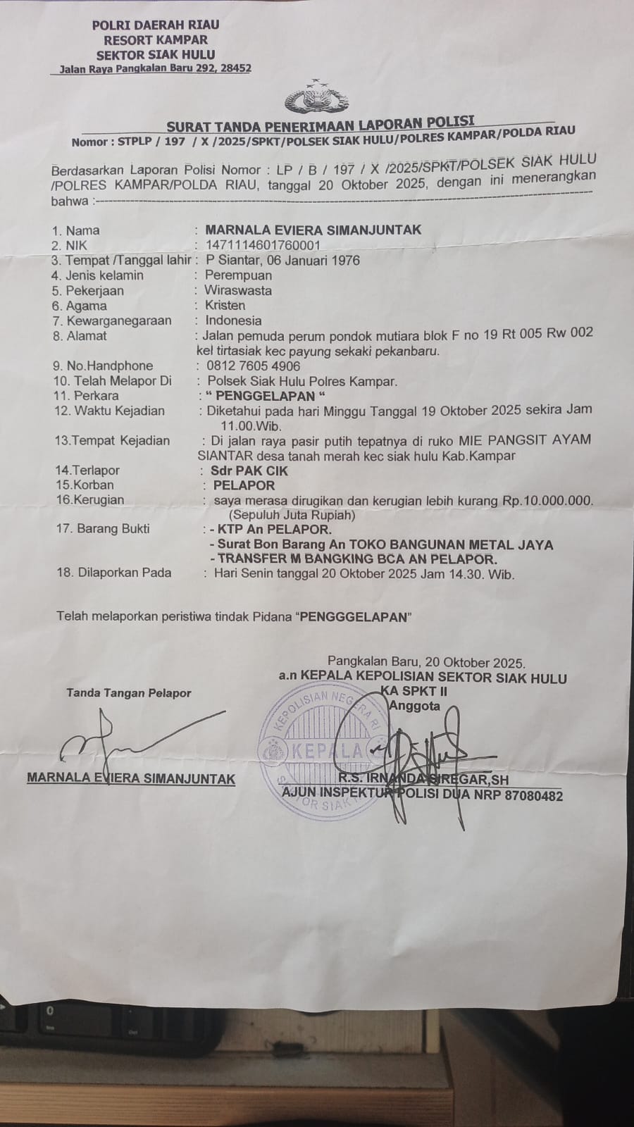 Pekanbaru, Riau, (Markibong.com) — Kepala Kepolisian Sektor (Kapolsek) Siak Hulu kembali menjadi sorotan publik, pasca ramainya pemberitaan seputar Lambannya Penanganan Kasus dan atau Perkara Penggelapan yang dilaporkan oleh seorang Warga dalam kapasitasnya sebagai Korban atas nama Marnala Eviera Simanjuntak.