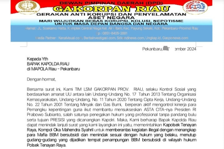 MARKIBONG.COM // Pekanbaru, Riau – Karena sudah 10 hari menunggu balasan surat dari Kapolsek Tenayan Raya, terkait hal permohonan Penindakan Hukum terhadap Gudang dan Mafia BBM Subsidi Ilegal di Wilkum Polsek Tenayan Raya, Pekanbaru, akhirnya LSM Gerakan Anti Korupsi dan Penyelamatan Aset Negara (Gakorpan) Prov. Riau, berencana akan melaporkan Kapolsek Tenayan Raya, Kompol Oka Mahendra Syahrial ke Kapolda Riau, Irjen Pol Muhammad Iqbal, pada hari Sabtu (07/12/2024) mendatang.