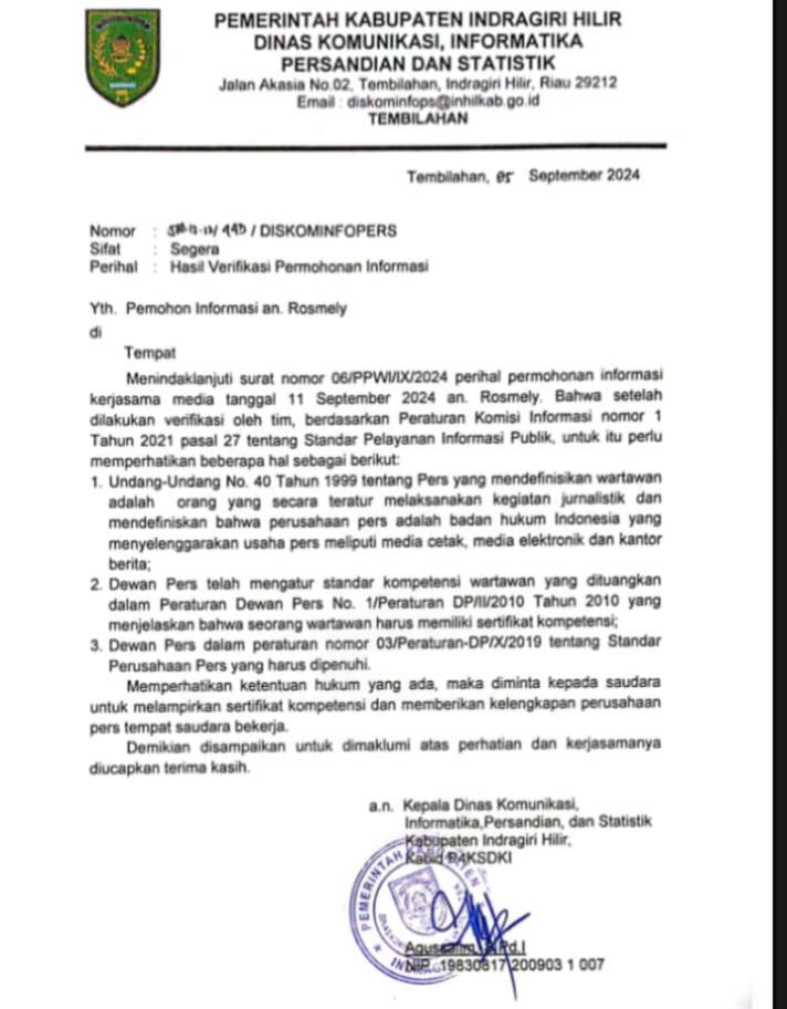MARKIBONG.COM // Inhil – Polemik terkait transparansi kerja sama media di bawah naungan Diskominfops Kabupaten Indragiri Hilir (Inhil) terus berkembang. Menanggapi surat yang diajukan oleh Ketua DPC PPWI Inhil kepada Menteri Dalam Negeri (Mendagri) terkait dugaan ketidaktransparanan dalam pengelolaan kerja sama media, Kepala Dinas Komunikasi dan Informatika (Diskominfopers) Inhil, Trio Beni, mengatakan Ia menegaskan bahwa Pemerintah Kabupaten Inhil telah melaksanakan keterbukaan informasi publik sesuai mekanisme yang berlaku.