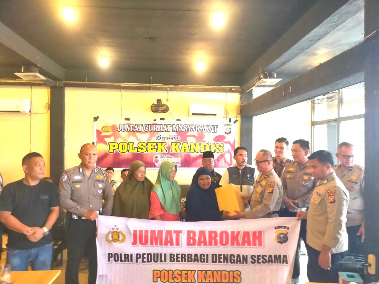 Usai kegiatan Jumat Curhat, Polsek Kandis melanjutkan dengan aksi sosial Jumat Barokah di Kelurahan Simpang Belutu. Bantuan sembako diberikan langsung oleh Kapolsek Kandis kepada tiga orang warga yang membutuhkan.