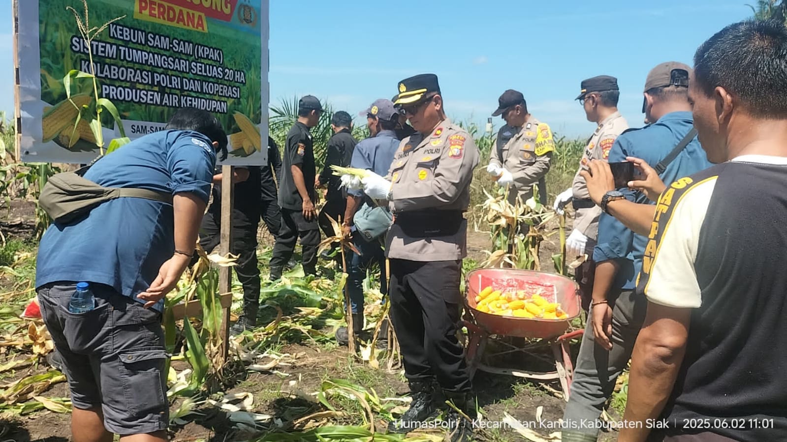 Kandis, Siak // MARKIBONG.COM – Dalam rangka mendukung program Presiden Republik Indonesia untuk mewujudkan ketahanan pangan nasional, Kapolsek Kandis Kompol Darmawan, SH, MH menghadiri kegiatan panen jagung perdana di lahan milik Koperasi Produsen Air Kehidupan (KPAK), Kampung Sam-Sam, Kecamatan Kandis, Kabupaten Siak, Senin (2/6).
