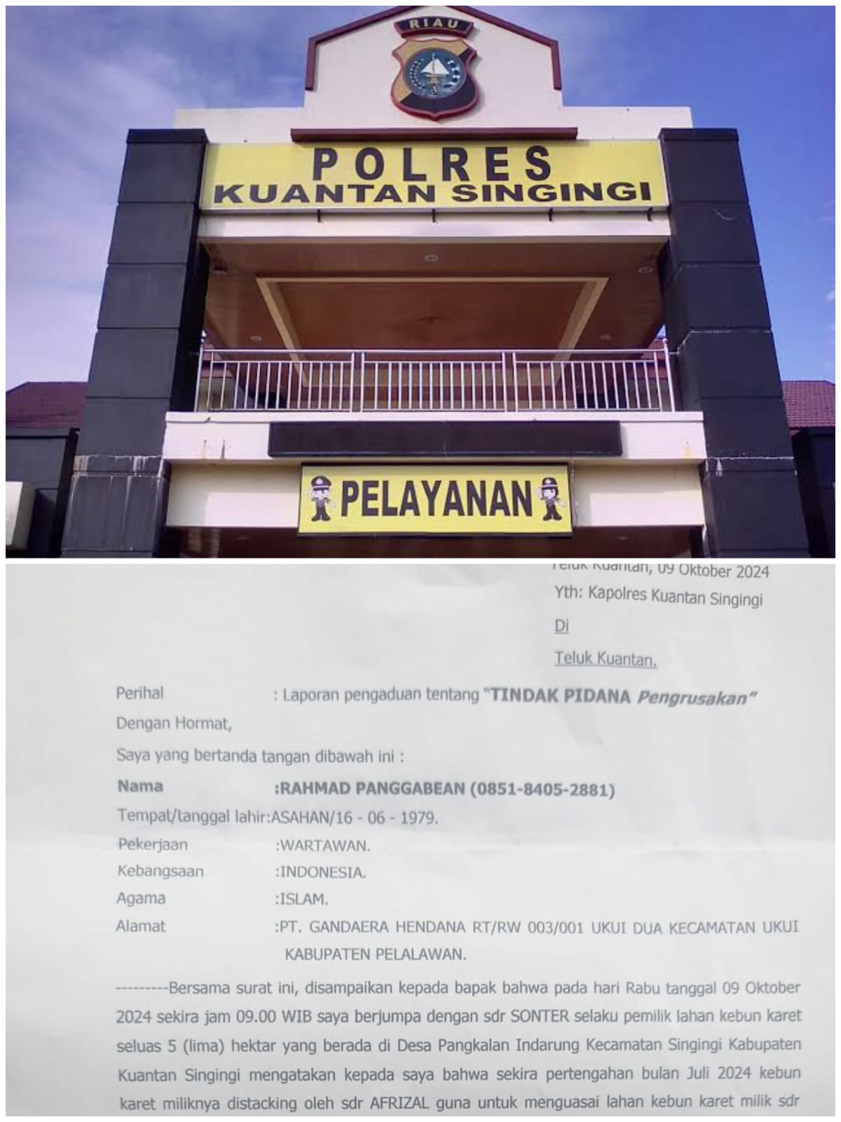 Untuk itu, pada Rabu (09/10/2024), Sonter melalui Ketua LSM Gerakan Anti Korupsi dan Penyelamatan Aset Negara (Gakorpan) Prov. Riau, Rahmad Panggabean, mengadukan pengrusakan kebun karet tersebut ke Polres Kuansing.