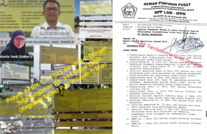 Sebagaimana yang viral pemberitaan sejumlah media sebelumnya terbitan lokal dan media nasional, terkait laporan sejumlah pekat pekerjaan BPJN Riau yang ditangani oleh Manila Yanti selaku (Ka.Satker PJN Wilayah I Riau). Yang telah dilaporkan Oleh LSM IPPH kepada Kapolda Riau, CQ. Ditreskrimsus Polda Riau. Yang sampai saat ini belum ada kejelasan perkembangan proses laporan tersebut.
