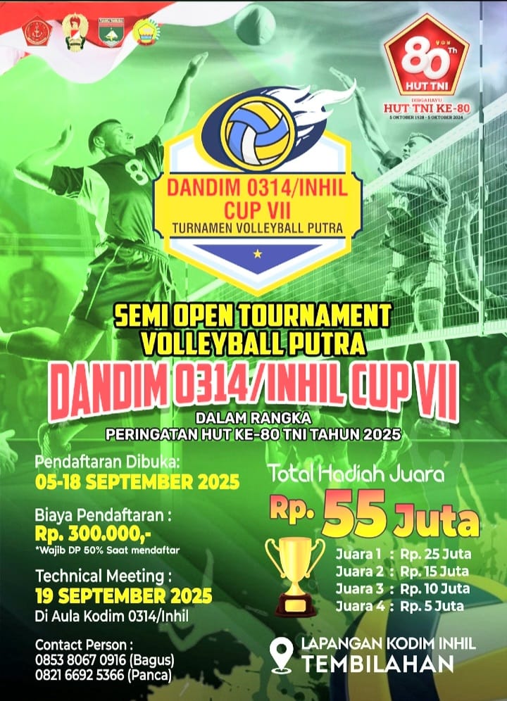 Turnamen prestisius ini akan melibatkan tim-tim bola voli terbaik dari berbagai daerah. Dengan format semi open, kompetisi terbuka bagi tim-tim lokal maupun luar daerah yang siap menguji kemampuan, strategi, dan mental bertanding di lapangan. Kodim 0314/Inhil menargetkan turnamen ini menjadi barometer perkembangan olahraga bola voli di Kabupaten Indragiri Hilir, sekaligus wahana pembinaan atlet potensial yang bisa melangkah lebih jauh ke tingkat provinsi maupun nasional.