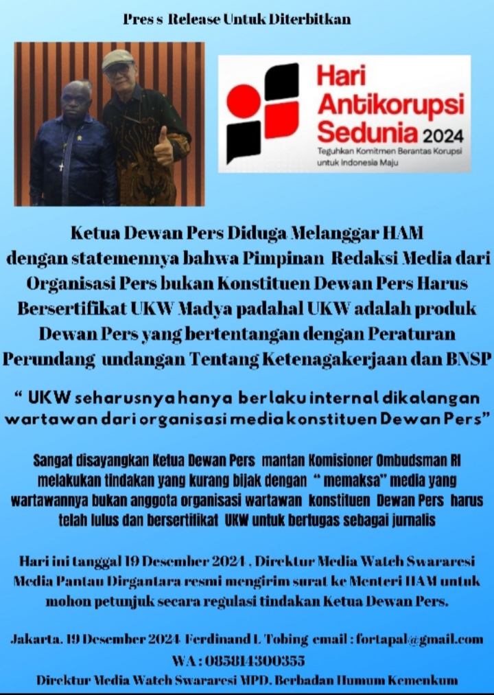 MARKIBONG.COM // Jakarta – Pada momen peringatan Hari Antikorupsi Sedunia 2024 yang bertema “Teguhkan Komitmen Berantas Korupsi untuk Indonesia Maju,” sorotan tajam justru mengarah kepada Ketua Dewan Pers. Ketua Dewan Pers dituduh melanggar Hak Asasi Manusia (HAM) terkait pernyataannya bahwa pimpinan redaksi media dari organisasi pers non-konstituen Dewan Pers wajib memiliki sertifikat Uji Kompetensi Wartawan (UKW) Madya.