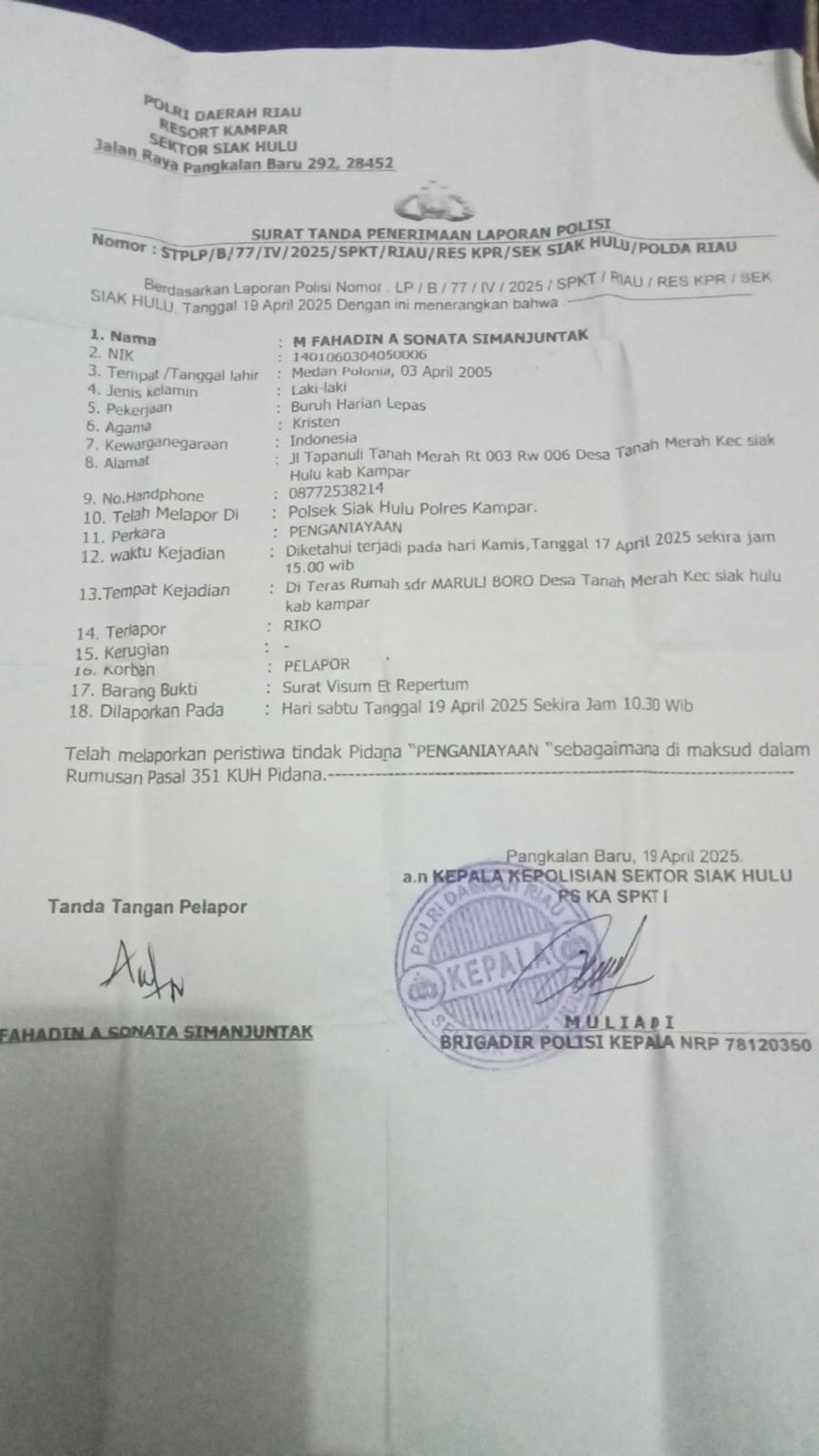 Untuk itu, dalam dugaan kasus jerat pidana pasal 351 KUHP yang tengah merugikan dirinya tersebut, Fahadin melalui orang tuanya (ibu) berulang kali mempertanyakan kinerja oknum Penyidik yang terindikasi ‘masuk angin’ terhadap laporannya yang tertuang di surat pengaduan masyarakat nomor: LP/B/77/ IV/2025/ SPKT/RIAU /RES KPR/SEK SIAK HULU,. Saat itu, hasil keterangannya telah diterima oleh Ka SPKT II Polsek , atas nama Brigadir Muliadi pada Sabtu silam, (19/06/2025).