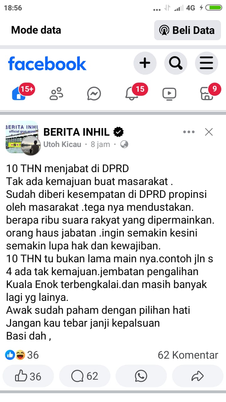 Keluhan ini diungkapkan dalam sebuah unggahan di media sosial oleh akun ber inisial UK di grup Berita Inhil. Postingan tersebut menyatakan bahwa meski telah menjabat selama satu dekade, tidak ada perubahan berarti yang dirasakan oleh masyarakat, terutama dalam pembangunan infrastruktur di daerah.