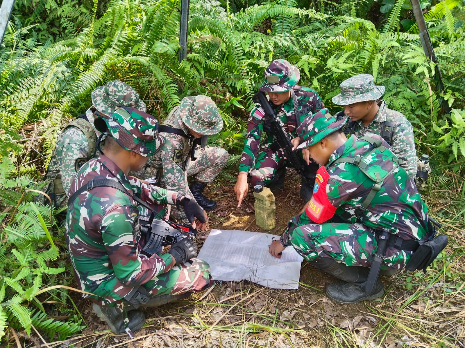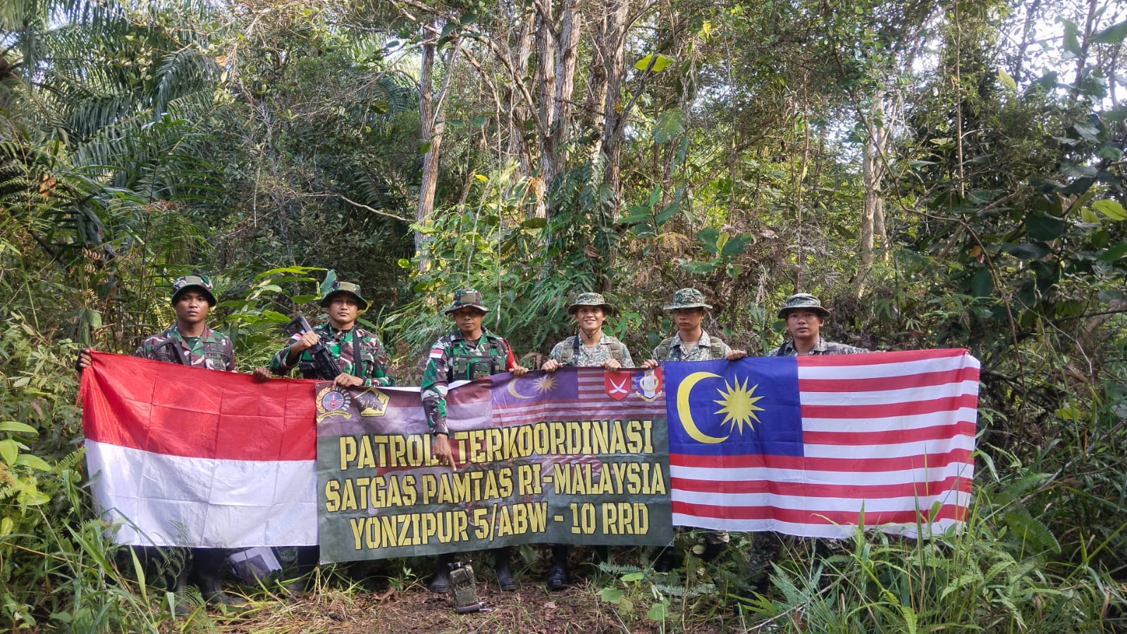 Prajurit TNI Satgas Pamtas RI-Malaysia Yonzipur 5/BW pos Gabma, pos Perumbang dan pos Mentari melaksanakan patroli patok di wilayah Mentari bersama Tentara Darat Malaysia (TDM) di wilayah Perumbang, Kecamatan Badau, Kabupaten Kapuas Hulu, Kalbar. Selasa (16/7/2024).