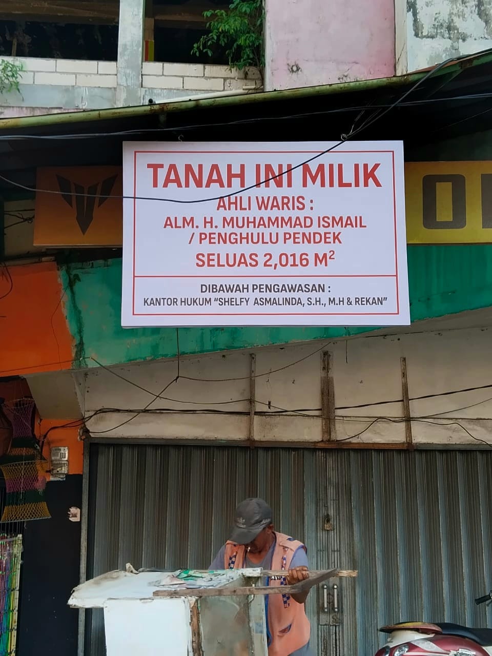 Di tengah kesunyian itu, sebuah spanduk putih mencolok kini terpasang di bagian depan. Tulisan besar di atasnya menegaskan klaim kepemilikan tanah seluas 2.016 m² oleh ahli waris almarhum H. Muhamad Ismail. Nama Kantor Hukum Shelfy Asmalinda, SH, MH, dan rekan tercantum tegas sebagai pengawas hukum atas tanah tersebut.
