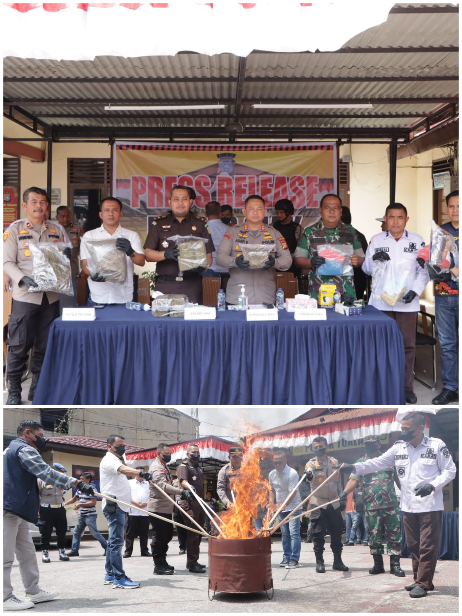 Usai gelar press release, Kapolres Siak bersama unsur terkait yang hadir memusnahkan sebagian barang bukti Narkotika daun ganja dengan cara dibakar