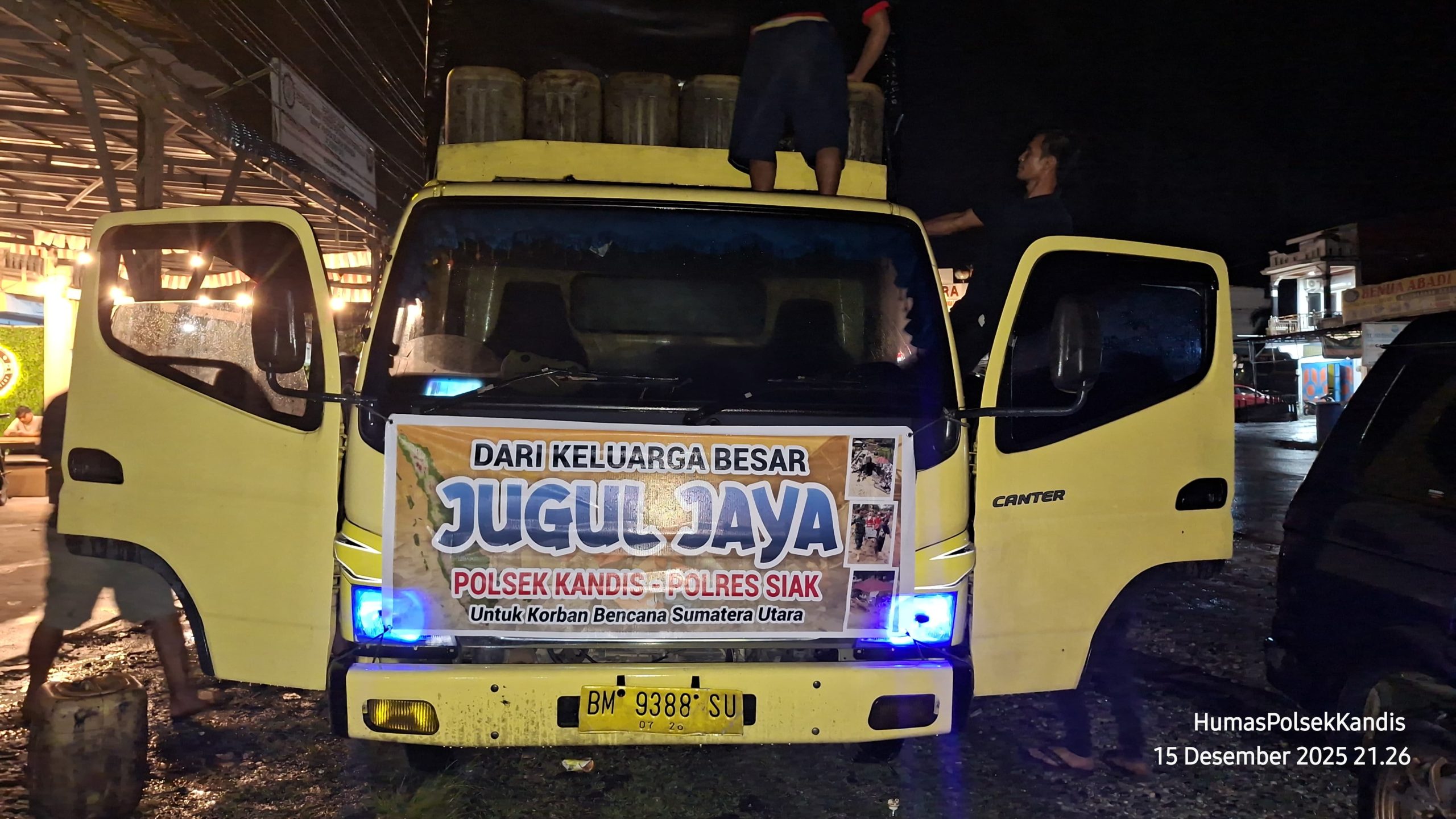 Siak // Markibong.com – Kepedulian terhadap sesama kembali ditunjukkan oleh Polres Siak bersama keluarga besar CV. Jugul Jaya. Pada Senin malam, 15 Desember 2025, sekira pukul 21.30 WIB, bertempat di halaman Polsek Kandis, telah dilaksanakan kegiatan pelepasan bantuan kemanusiaan bagi korban bencana alam yang melanda wilayah Sumatera Utara, Sumatera Barat dan Aceh.