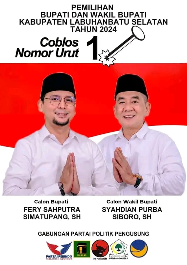 MARKIBONG.COM // Kotapinang_Labusel, Sumut – SA.Pasaribu salah satu Wartawan Online GaspolNews.Com yang bertugas diwilayah Kabupaten Labuhan Batu Selatan Sumatera Utara,mengapresiasi dan mengucapkan selamat atas terpilihnya kandidat Bupati dan wakil Bupati Fery Syahputra Simatupang,SH,dan wakil Bupati Syahdian Purba Siboro,SH.(FS) nomor urut (1) sebagai pemenang dalam kontes demokrasi menjadi Bupati dan wakil Bupati labusel,Untuk priode masa bakti thn 2024-2029.