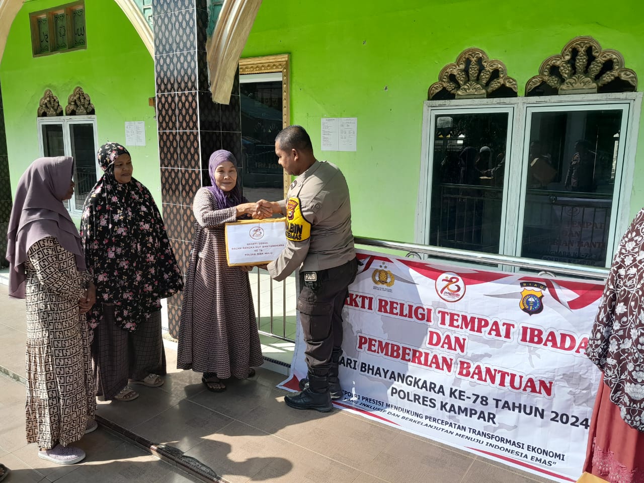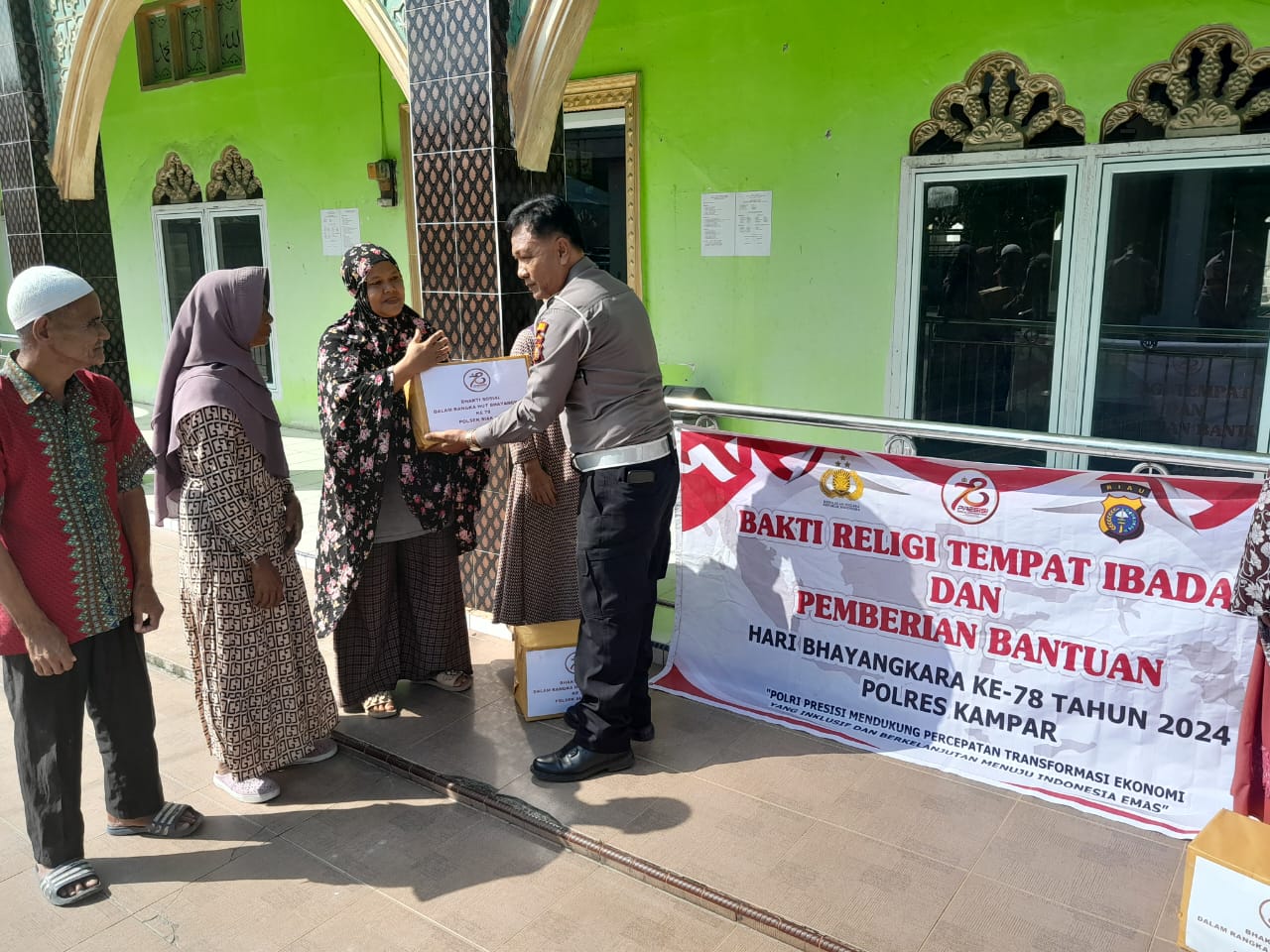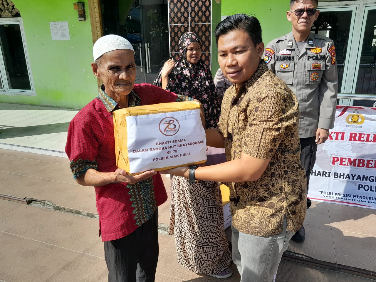 Setelah melaksanakan giat Religi, dalam rangka menyambut HUT Bhayangkara Ke-78 Kapolsek Siak Hulu AKP Asdisyah Mursyid, S.H yang diwakili Kanit Lantas Iptu JP. Hasibuan berkesempatan memberikan paket sembako kepada 10 warga yang kurang mampu yang ada di sekitar lingkungan Mesjid Wahidin Desa Baru.