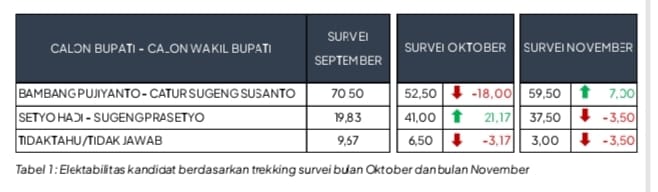Hasil survei Indopol hingga Kamis 21 November 2024 menunjukkan pasangan Bambang Pujiyanto –Catur Sugeng Susanto (Bambang-Catur) unggul dengan elektabilitas 59,5% dan pasangan Setyo Hadi – Sugeng Prasetyo (Hadi-Sugeng) memperoleh elektabilitas 37,5%.