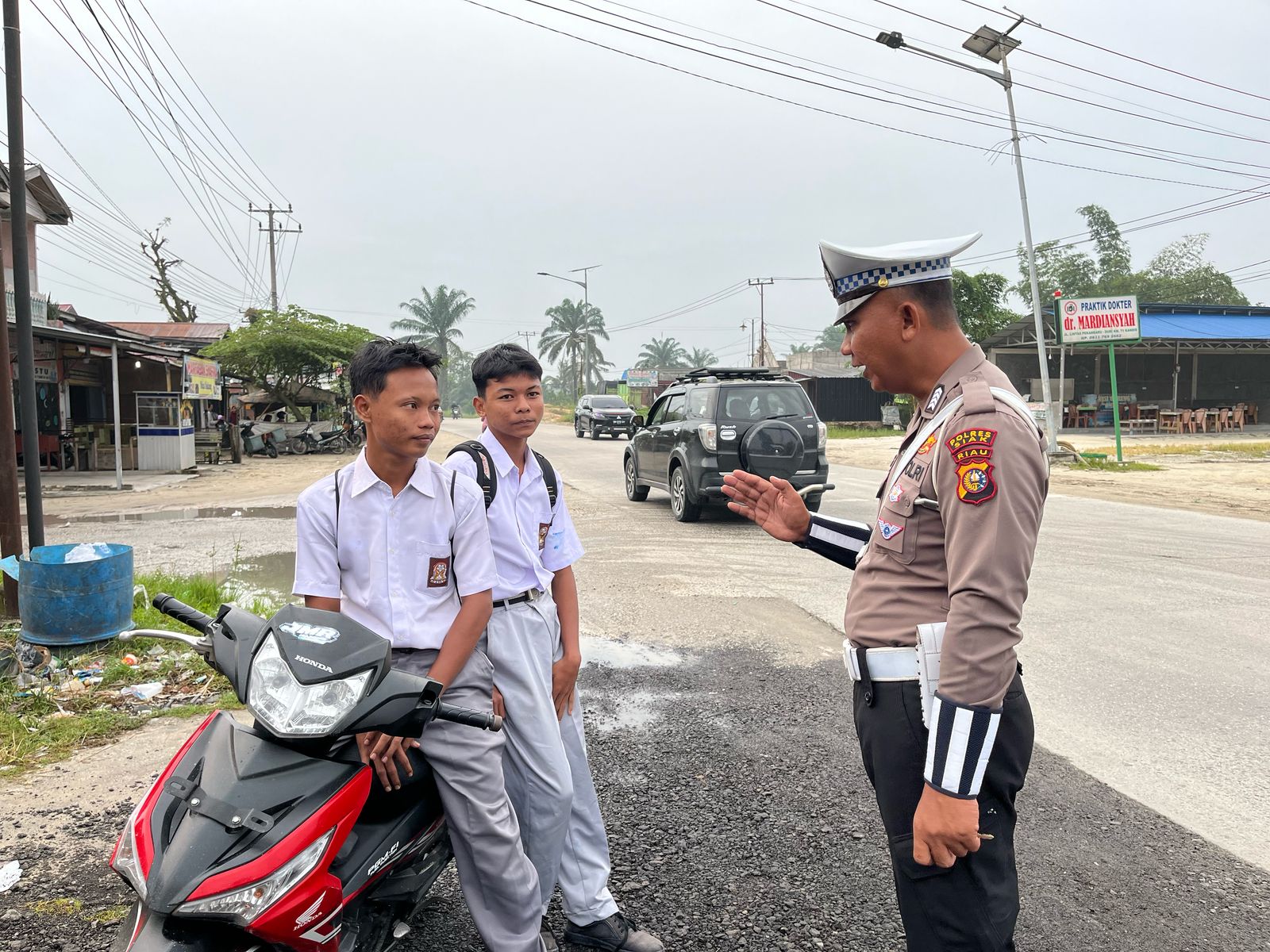 Himbauan tertib berlalu lintas dalam rangka Ops Keselamatan Lancang Kuning 2025 juga disampaikan secara humanis oleh Anggota Unit Lantas Polsek Kandis kepada para pelajar di simpang Pelajar, Kec. Kandis, Kab. Siak untuk memakai helm SNI saat berkendara ke sekolah.